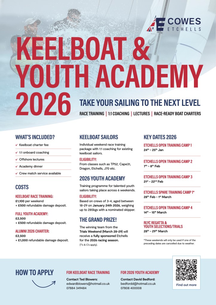 The Royal London Etchells Youth Academy 2025 has got underway with 5 teams including teams from Oxford, Cambridge and Bournemouth Universities. Cowes Keelboat Youth Charity is proud to support the Academy with loan of 5 boats. 3 training camps have taken place so far and all crews have made excellent progress.